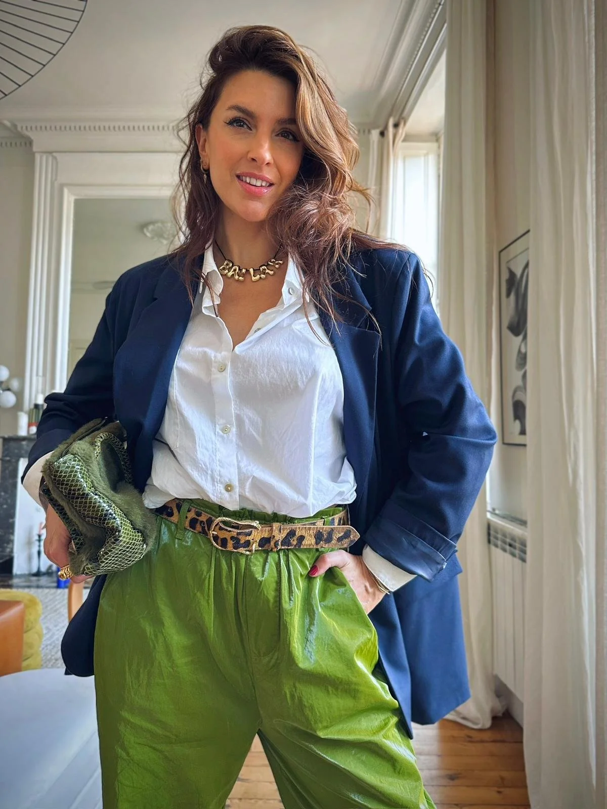 Styling doesn’t always play by the rules. Sometimes, it reimagines them. Tying a scarf at the waist, over an untucked white shirt, replaces a belt and adds an original and fashion-forward flair. It introduces movement, color, and a sense of spontaneity. Like the outfit came together naturally, even if every detail was carefully considered.