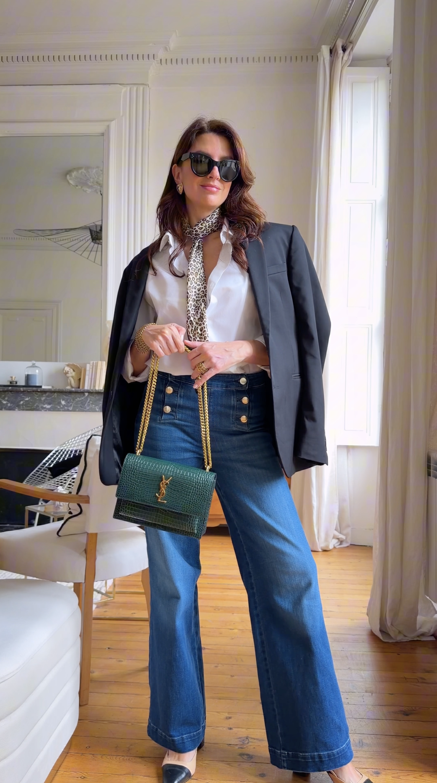 A leopard scarf instantly transforms a classic white shirt. It brings a chic yet bold touch, and adds some much-needed contrast. Soft against structure, pattern against minimal. The right choice in scarf modernizes and personalizes the outfit. The look remains effortlessly elegant, but becomes just that little less predictable.